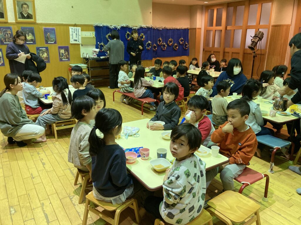 バスと電車に乗って、山崎駅から徒歩10分ほどの山崎保育園に着き、聖劇を見た後、おやつのキャロットケーキをいただきました。